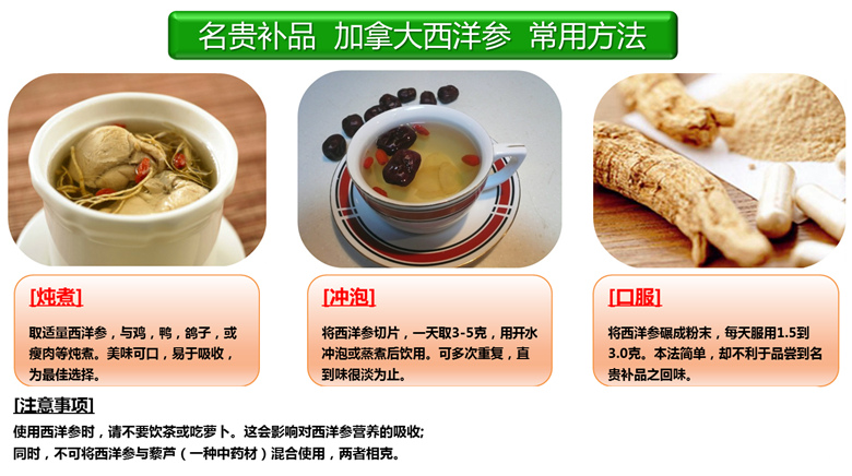 西洋参(学名:Panax quinquefolius)是五加科人参属多年生草木植物,别名花旗参、洋参、西洋人参、American ginseng,原产于加拿大的大魁北克与美国的威斯康辛州,中国北京怀柔与长白山等地也有种植。加拿大产的叫西洋参,美国参产的叫花旗参,服用方法分为煮、炖、蒸食、切片含化、研成细粉冲服等。